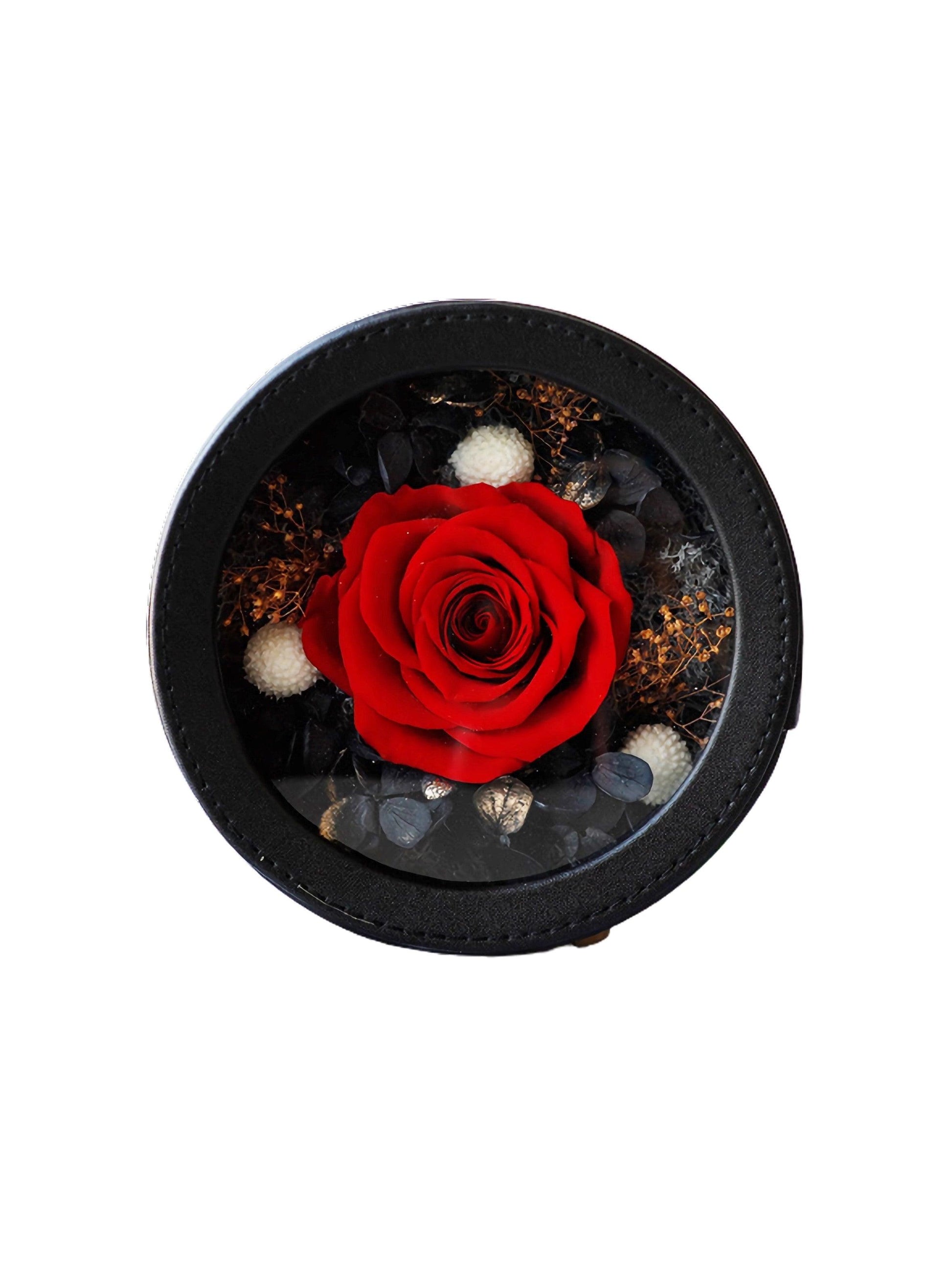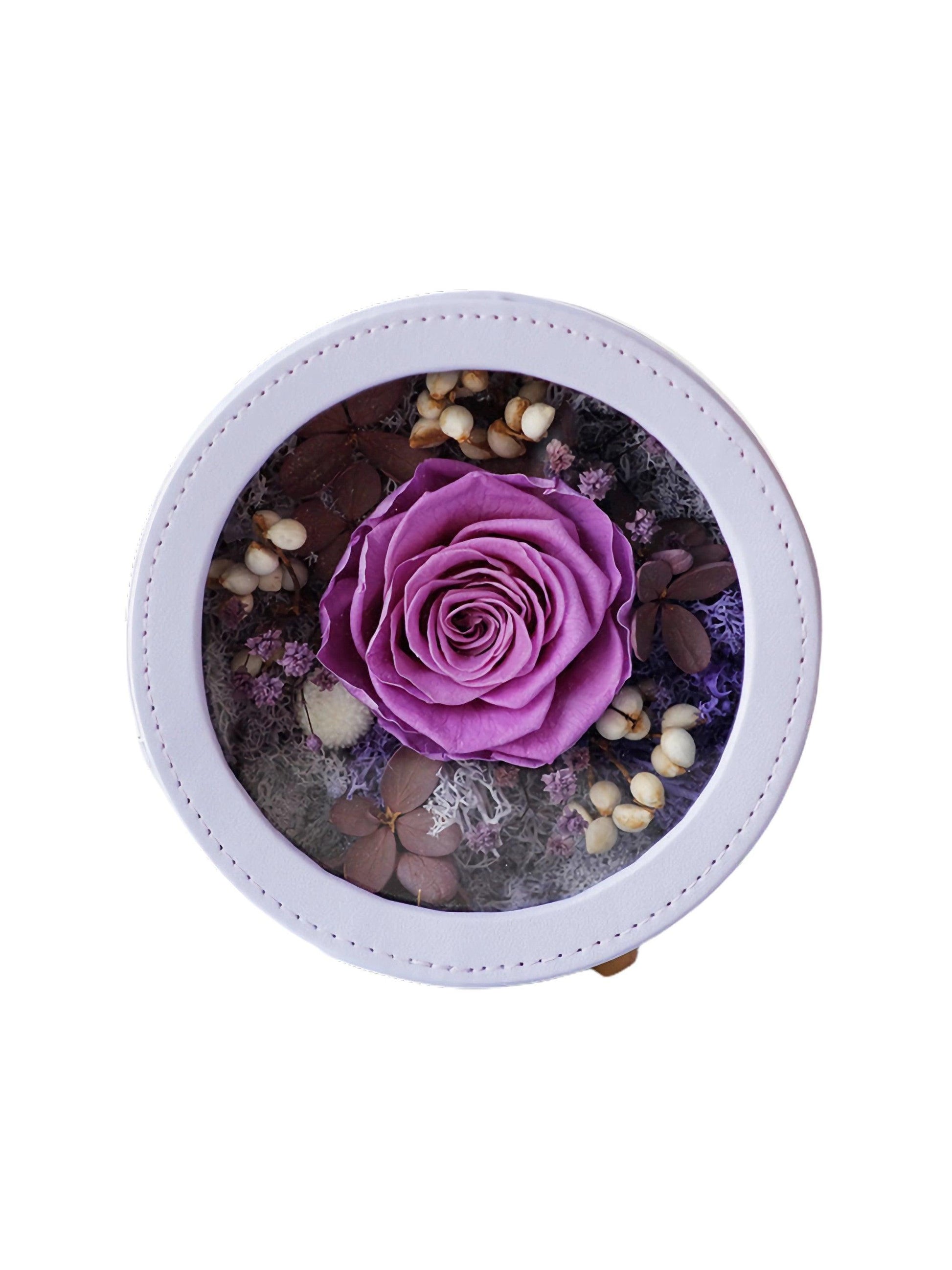 This exquisite Preserved Flower Arrangement features a stunning rose at its heart. Surrounded by delicate petals and berries, the rose is set in a gift box, creating a romantic atmosphere. The arrangement adds an elegant and sweet touch. This product offers a lasting beauty that never fades.